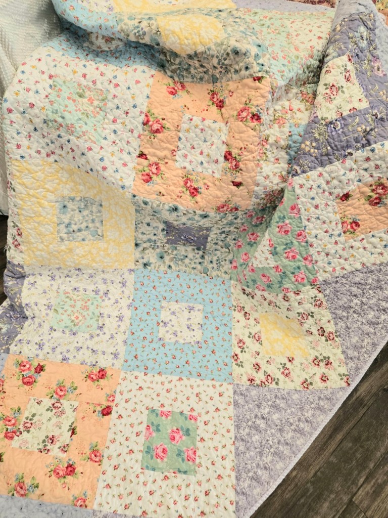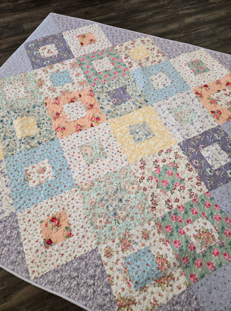 tina has been hard at work on some new projects for the shoppe. these 2 projects don’t use specific collections. instead a variety of florals were picked for each project. it shows the versatility of the fabrics we curate and i do love quilts that look like grandma put them together with what she had leftover from other quilts, clothing, pillowcases, aprons…you name it. tina and mom is a wonderful job curating these 2 quilts.