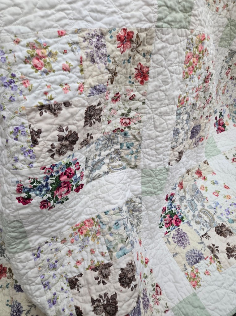 Wildflowers & Ice Cream…a combination of white/cream background florals and “dark” florals (which of course just means the background isn’t white). These combine to create a project bursting with flowers. A project that is somewhat modern yet, soft, sweet, and gentle and something your grandma made. She is square at 66 x 66 so it would make a perfect throw, of course, but could also be used on an Easter table or over the railing for sprinf.