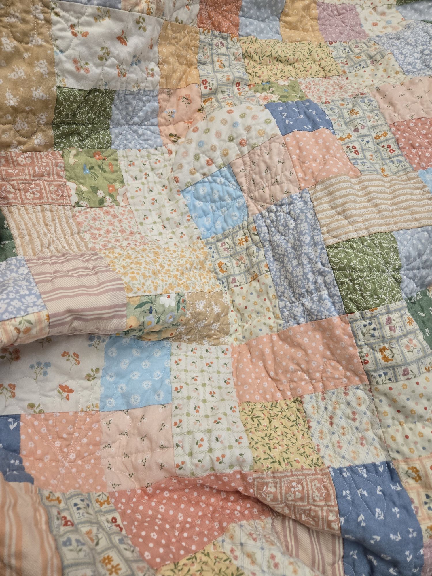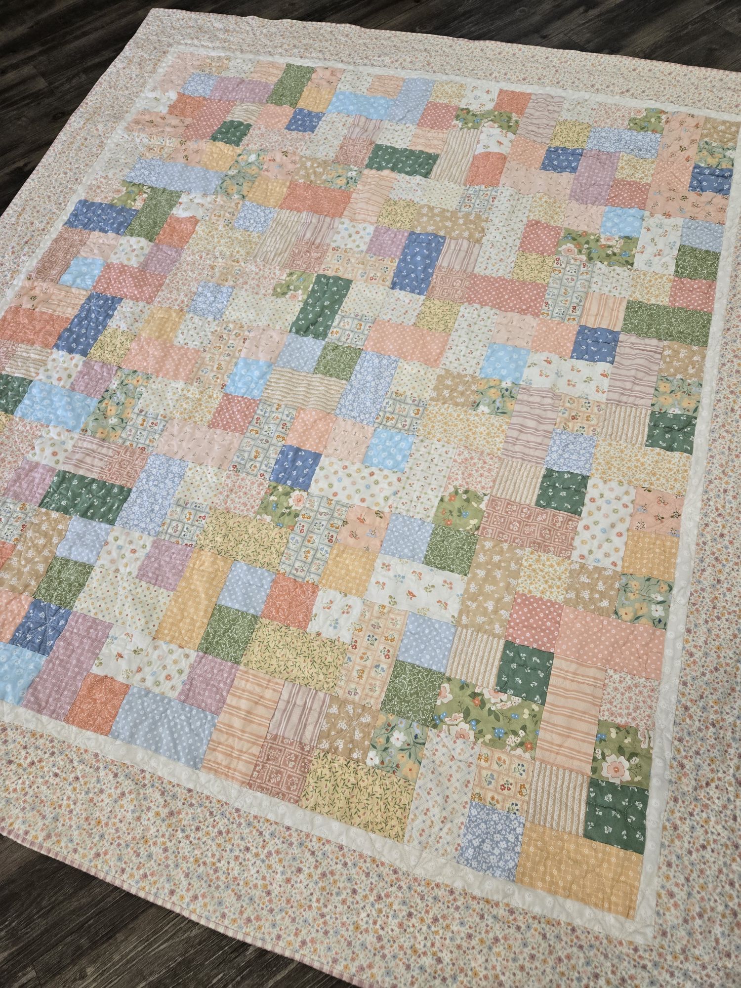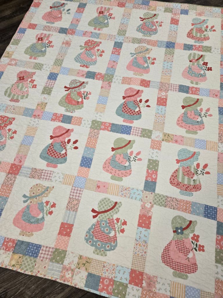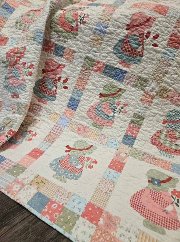 and lastly…Penny Q. named after my neice…Pennelope Quinn. this cheery, cheeky little Sunbonnet girl looks like she’s picked all the garden blooms and cannot wait to decorate the picnic table. not into appliqué…no worries cuz she is PREPRINTED!! so you can finish her up in an evening with her strip pieced sashing. finishing at 52 x 70 inches…Penny Q. kits can be found here.