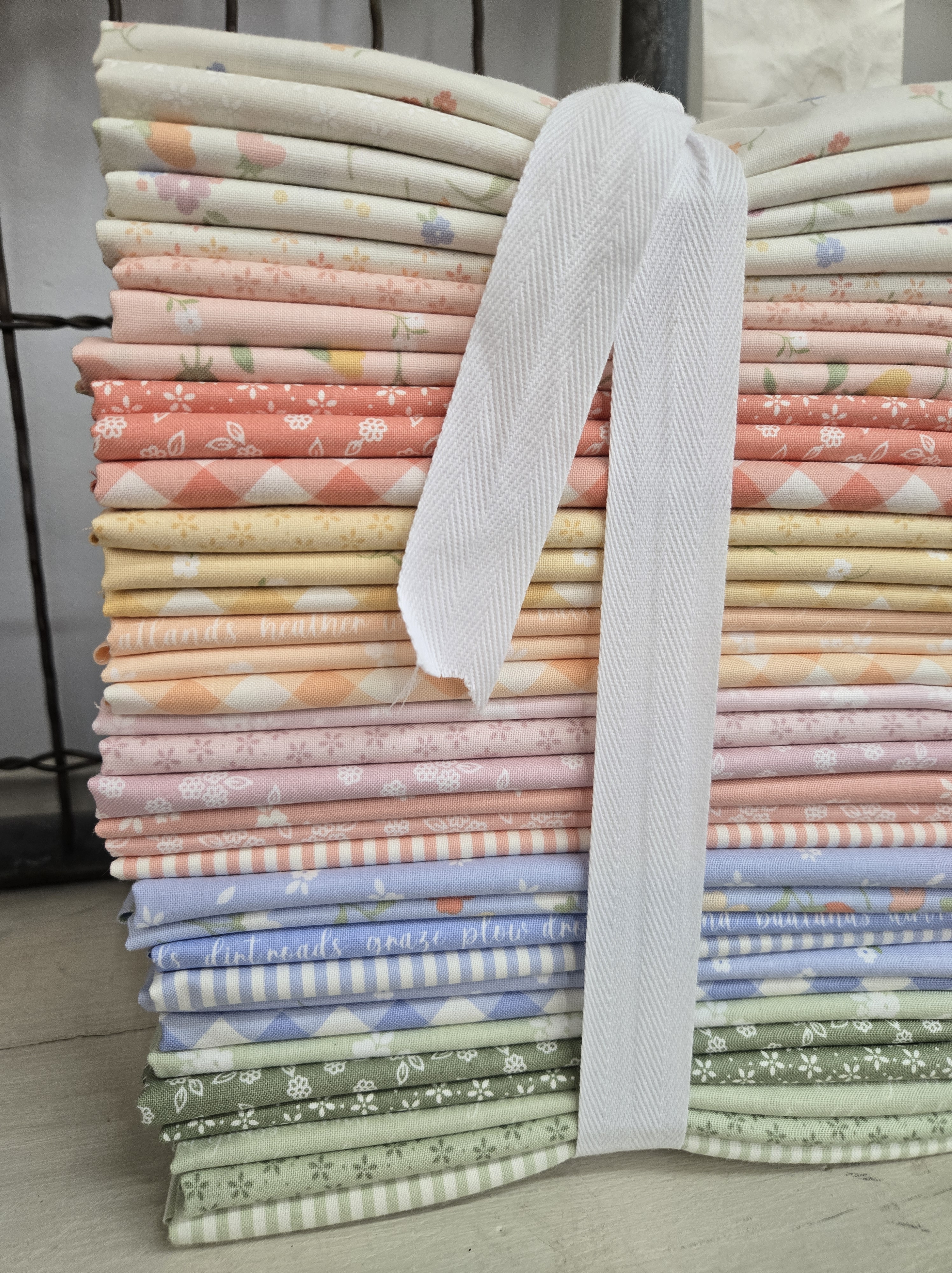 Pastel Prairie…heather briggs, of my sew quilty life, has done it again. a lovely palette of summery porcelain, misty blue, coral, pink, and pear with bits of jovial and demure. we are so excited to add these prints to our already lovely offering of her fabrics. we’ve even separated out the colors to give you more small bundle options…i’ll be getting those online this afternoon/evening! this is the full collection in half yards. it makes quite a statement. it always helps when her fabrics are so delicious!!