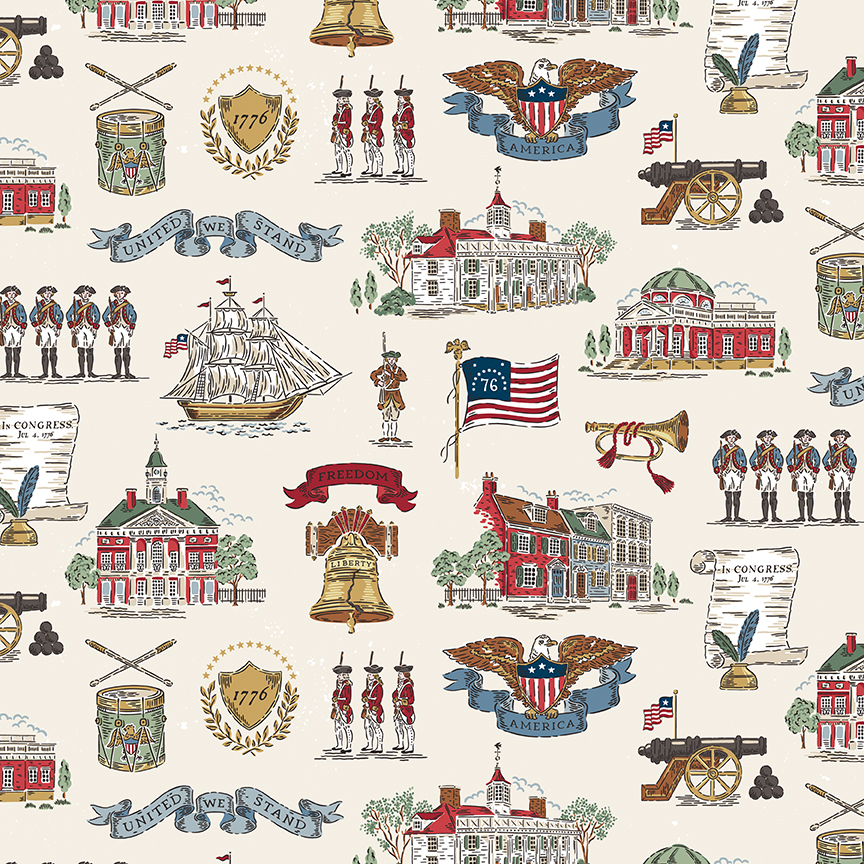 Independence by RBD Designers…this joint effort is a perfect way to celebrate our 250th birthday! A patriotic mix of red, beige, gold, and light and dark blue. classic motifs include stars, drums, a script featuring the Declaration of Independence, and a colonial America print (below). the entire Independence collection can be found in our online shop here.